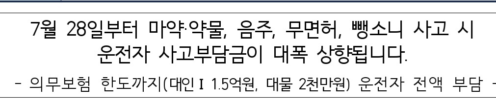 국토교통부는 마약(약물), 음주, 뺑소니 사고 시 운전자가 한도내에서 피해자에게 지급된 보험금 전액을 사고부담금으로 부담하게 하는 [ 자동차손해배상 보장법] 개정안이 오는 7월 28일부터 시행된다고 밝혔다.