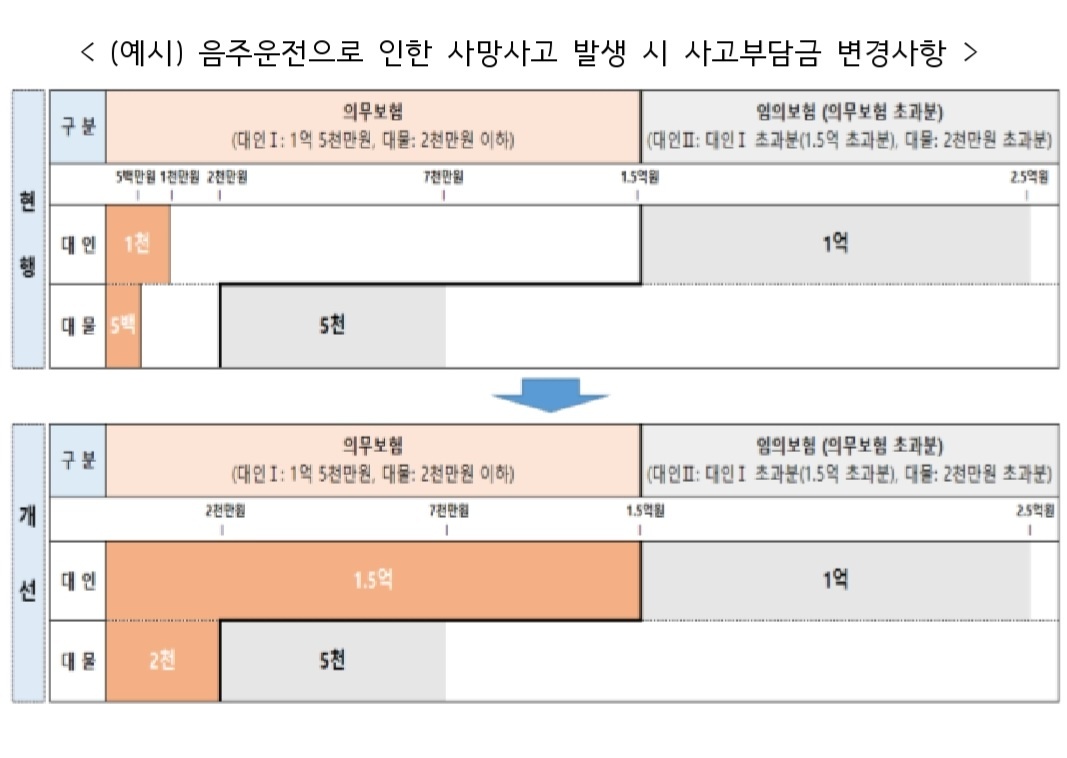 국토교통부(장관 원희룡)는 마약·약물, 음주, 무면허, 뺑소니 사고 시 운전자가 의무보험 한도* 내에서 ‘피해자에게 지급된 보험금 전액’을 사고부