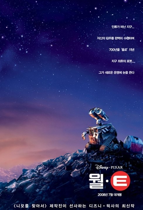 워..리? 이..바? 라고 서로의 이름을 부는 것이 가장 기억이 남는 영화입니다. 이 영화는 미래의 지구를 보여주면서 시작합니다. 그리고 사람들에게 환경오염의 심각성을 인식시켜줍니다. 처음에는 재난 영화인가 라는 생각도 했지만 곧 월E와 이브의 만남을 보게 됩니다. 그리고 너무 귀여운 두 로봇의 모습에 웃음이 절로 났습니다. 영화는 로봇들에게는 일하면서 공감하는 능력을 주웠지만 대조적으로 인간은 로봇에게 모든 것을 의존하며 살아가는 쓸모없는 존재로 표현하였습니다. 그만큼 사람들 사이가 삭막해졌다는 것을 보여주는 것 같습니다. 우리의 미래는 로봇에 의존하기보다 서로의 이름을 불러주고 서로의 손을 잡아주는 그런 미래가 되었음 하는 바람입니다. 지금 우리가 사는 지구에게 감사하는 마음을 갖아야 하며 지구는 지금의 환경오염뿐만 아니라 인간관계의 문제점을 보여주고 있습니다. 지금 우리의 지구는 과연 안전할까요? 지구의 삭막함 속에서 누군가의 온기를 원하던 월E에게 다가온 이브! 두 로봇의 우정이 보고 싶으시다면 월E를 추천드립니다.