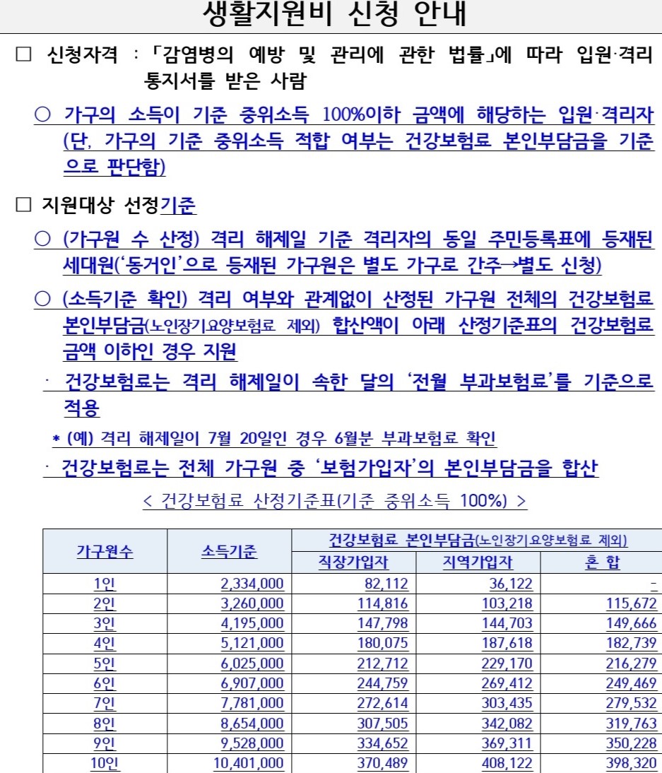 - 7월 11일 자로 적용되며 격리 해제 전월의 건강보험료를 기준으로 가구 소득이 기준 중위소득 100% 이하에 해당한다.